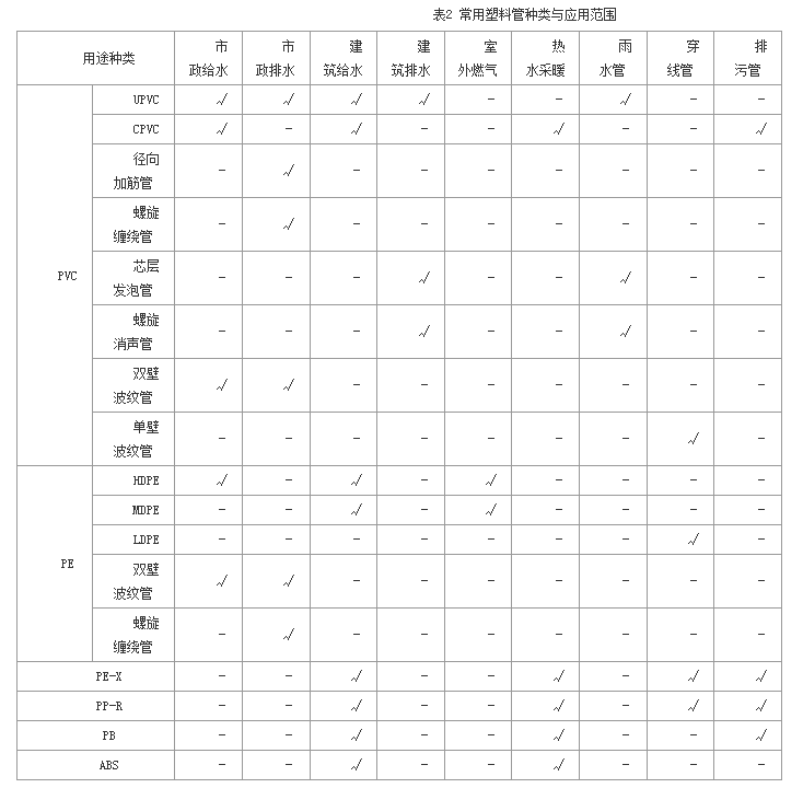 塑料管有熱塑性塑料管和熱固性塑料管兩大類。熱塑性塑料管采用的主要樹脂有聚氯乙烯樹脂(PVC)、聚乙烯樹脂(PE)、聚丙烯樹脂(PP)、聚苯乙烯樹脂(PS)、丙烯J ing -丁二烯-苯乙烯樹脂(ABS)、聚丁烯樹脂(PB)等;熱固性塑料采用的主要樹脂有不飽和聚酯樹脂、環氧樹脂、呋喃樹脂、酚醛樹脂等。